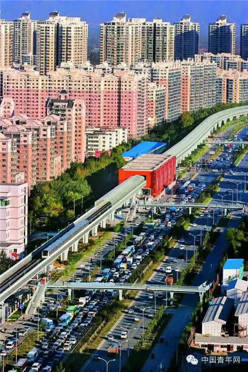 (北京天通苑的小区建筑格局呈现“排式”状,道路和小区平行分布,所有的住户上班都只能通过主干道,每天高峰期的时候,主干道拥堵已是常态。)