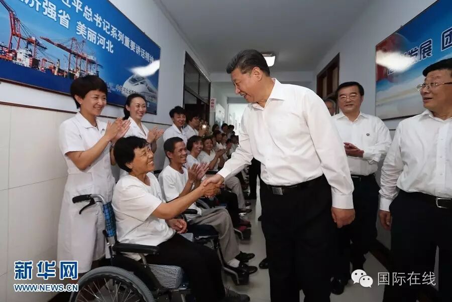 之后,习近平前往唐山市截瘫疗养院。他在康复室看望正在做康复训练的截瘫伤员,一一了解他们的伤情和康复治疗情况,问他们还有什么困难,祝他们健康长寿。在疗养病室,他同因地震伤害截瘫的杨玉芳、高志宏夫妇亲切交谈。得知他们长期参加力所能及的劳动和工作,努力融入社会、自食其力,习近平很高兴。夫妇俩向总书记赠送自己新近出版的小说和诗歌集,并即兴朗诵了一首歌颂解放军当年抗震救灾英勇事迹的诗歌,习近平称赞他们乐观上进、事迹感人,用行动诠释了生命的价值和意义。活动室内,10多位截瘫伤员正在开展文娱活动,习近平来到他们中间,同他们亲切交谈,并欣赏了二胡伴唱《唱支山歌给党听》。习近平勉励他们说,健全人可以活出精彩的人生,残疾人也可以活出精彩的人生。我们每个人都要珍惜生命、追求健康,努力创造无愧于时代的精彩人生。习近平指出,大爱无疆,医者仁心,医护人员要树立把伤残人当亲人的思想,为伤残人提供周到细致的服务。
