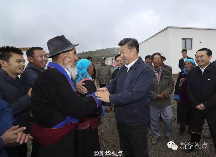 【习近平冒雨考察易地扶贫搬迁新村】习近平总书记23日上午来到海东市互助土族自治县五十镇班彦村,考察易地扶贫搬迁新村建设情况。在新村建设工地,习近平冒着蒙蒙细雨,走过尚未完工的泥泞道路,来到村民吕有章的新家,察看房屋格局,了解施工进展,关心火炕取暖效果。班彦村旧村处在生存条件十分恶劣的地带,山上不通自来水,村民们用的都是窖水。看到新居的院子里两个水桶装上了自来水,习近平说,新村水、电、通信都方便了,希望乡亲们日子越过越好。